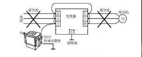 2、通用變頻器不宜做耐壓實驗及絕緣電阻實驗。做時應當使用500V絕緣電阻表測量,盡可能減少搖測次數。絕緣前應斷開全部的外接主電源與控制線路并短接主電路;對地絕緣應保證在5兆歐以上。具體如下圖: