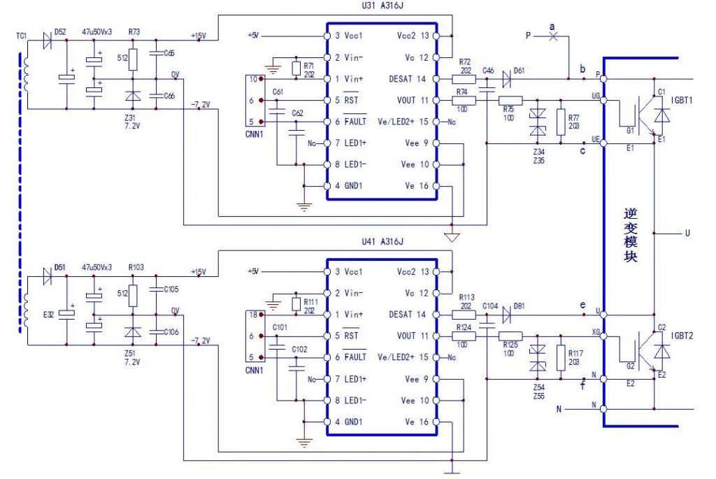 - 先檢查+15V、-7.2V的驅動供電電源是否正常。若無負壓,檢查穩(wěn)壓電路并排除;測得輸出電壓偏低,A316有異常溫升,脫開柵極電阻R74,供電電壓正常,為模塊內部IGBT的G、E結漏電損壞,更換模塊;供電電壓仍低,挑開A316的12/13腳,供電電壓恢復為正常值,更換A316J;