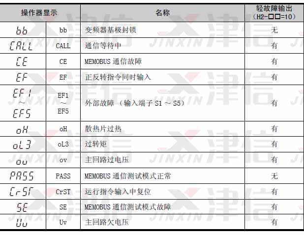 - 輕故障時∶進(jìn)行多功能接點輸出H2-01=10 (輕故障)的設(shè)定時,信號關(guān)閉。