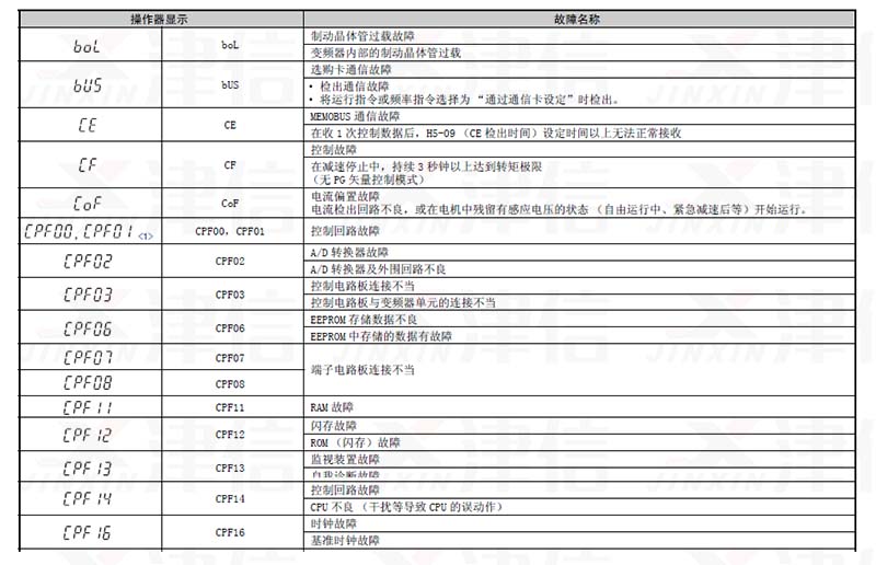 | CPF02 | 控制回路故障 | 變頻器發生硬件故障 | 重啟變頻器,確認故障是否持續;若故障持續發生,則更換電路板或變頻器。關于主板更換,請向本公司代理商或銷售負責人垂詢。(注:為了清除故障,需要進行故障復位操作;無法進行故障跟蹤) |