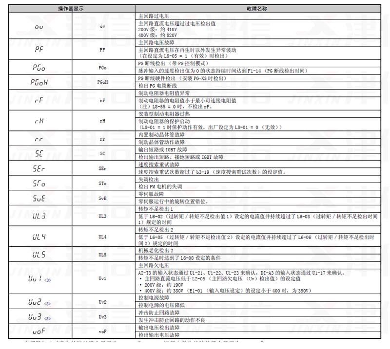 一、uoL,uUS,CE,CF,CoF,CPF00、CPF01,CPF20、CPF21,CPF02,CPF03,CPF06,CPF07,CPF08,CPF11,CPF12,CPF13,CPF14,CPF16,CPF17,CPF18,CPF19,CPF22,CPF23,CPF24,CPF26 ~ CPF34,CPF40 ~ CPF45,dEv,dv1,dv2,dv3,dv4,dv7,dWAL,dWFL故障代碼